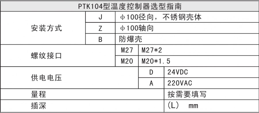 PTK104智能數(shù)字溫度控制器是集溫度測(cè)量、顯示、輸出、控制于一體的智能數(shù)字溫度測(cè)控產(chǎn)品。不銹鋼接頭、高精度PT100、全數(shù)字電路板組成,顯示直觀,操作簡(jiǎn)單,安全可靠,開關(guān)點(diǎn)現(xiàn)場(chǎng)設(shè)置。廣泛應(yīng)用于水電、自來水,石油、化工、機(jī)械、液壓等行業(yè),對(duì)流體介質(zhì)的溫度進(jìn)行測(cè)量和控制。
